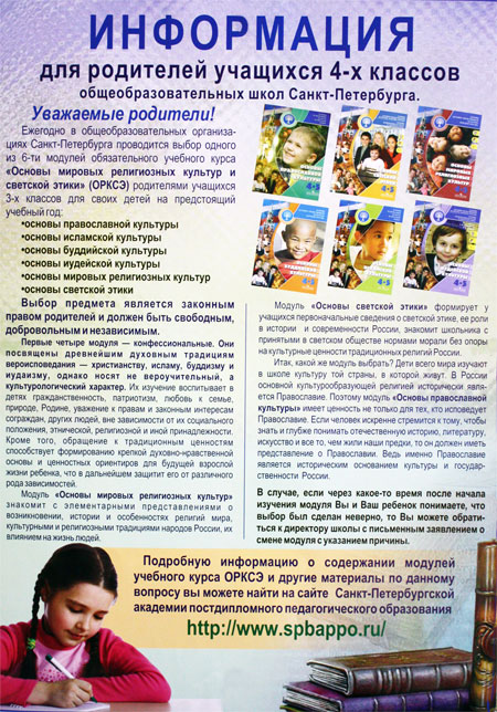 - ПЛАКАТ об учебном курсе «Основы религиозных культур и светской этики» в целях оказания помощи родителям (законным представителям) в принятии решения о выборе модуля